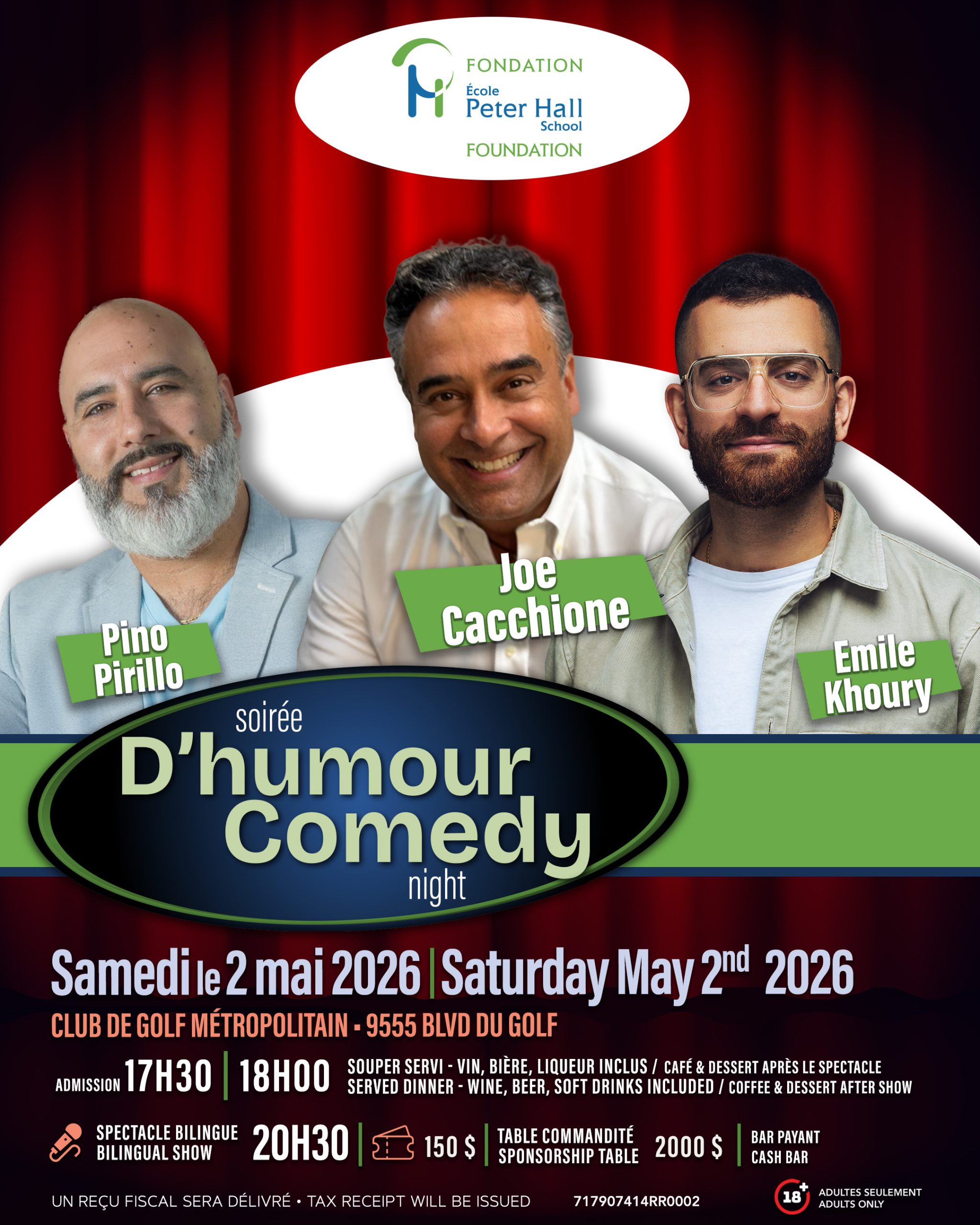 Joignez-vous à nous le samedi 2 mai 2026 pour cet événement d’humour bilingue, haut en couleur, qui promet de plaire à tous. La soirée comprend également un délicieux souper servi à table, incluant vin, bière, boissons gazeuses, ainsi qu’un dessert accompagné de café. Un bar payant sera également disponible tout au long de la soirée.